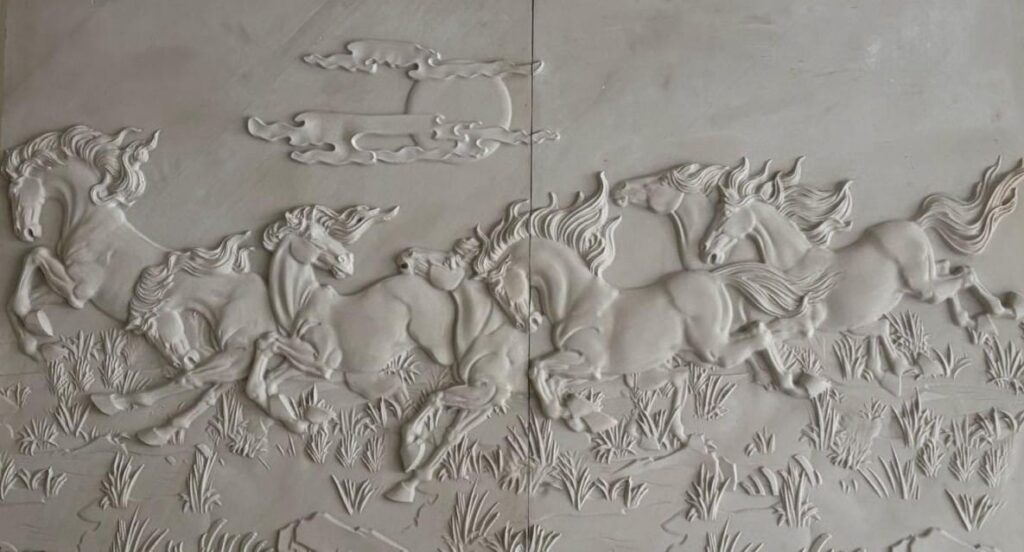 setting. Expertly sculpted with dynamic movement and fine details, this running seven horse stone wall mural brings a sense of energy and motivation to your home or office. The lifelike horses and textured stone craftsmanship create a captivating focal point that draws the eye and inspires the spirit. Crafted to stand the test of time, this piece is an excellent example of a natural stone wall mural.